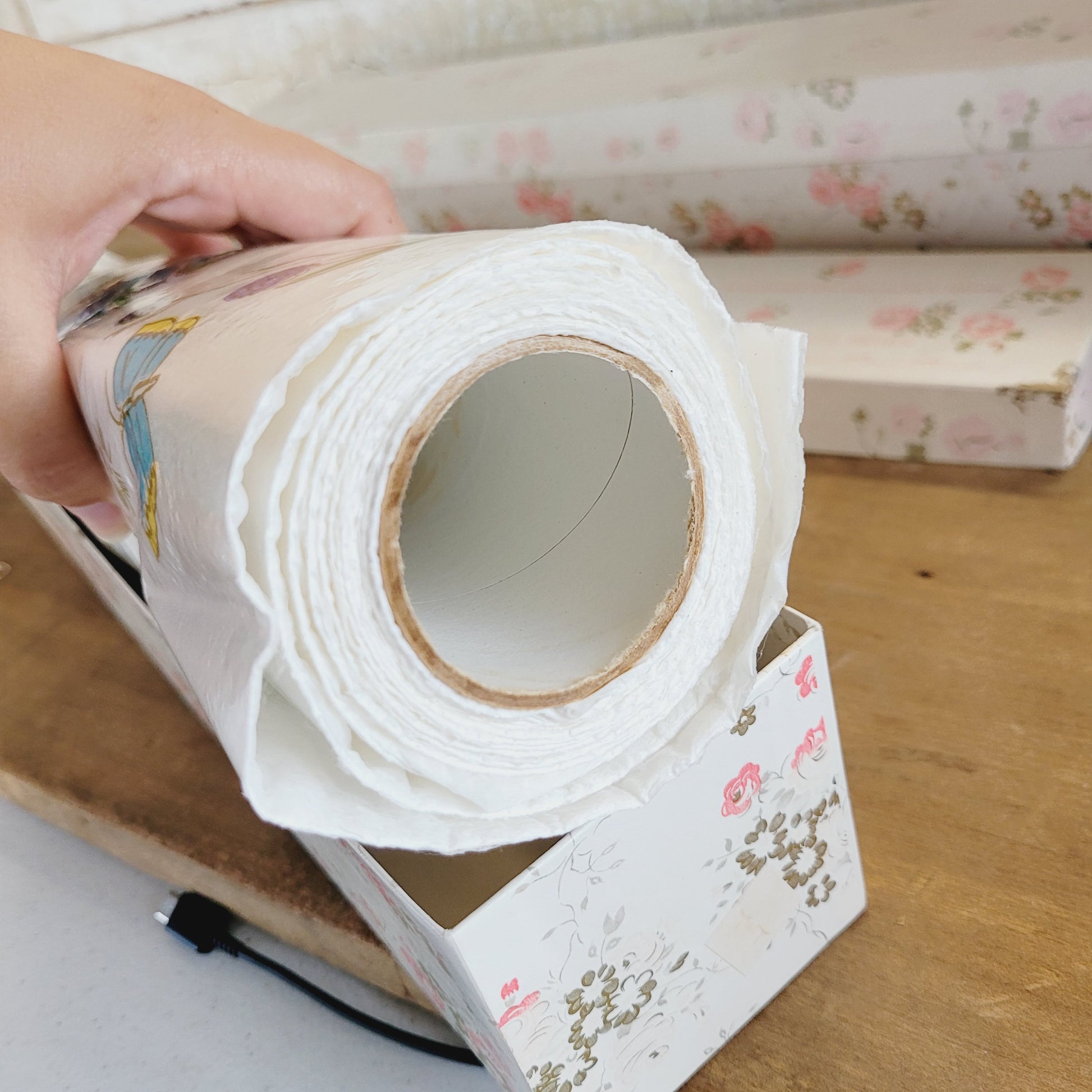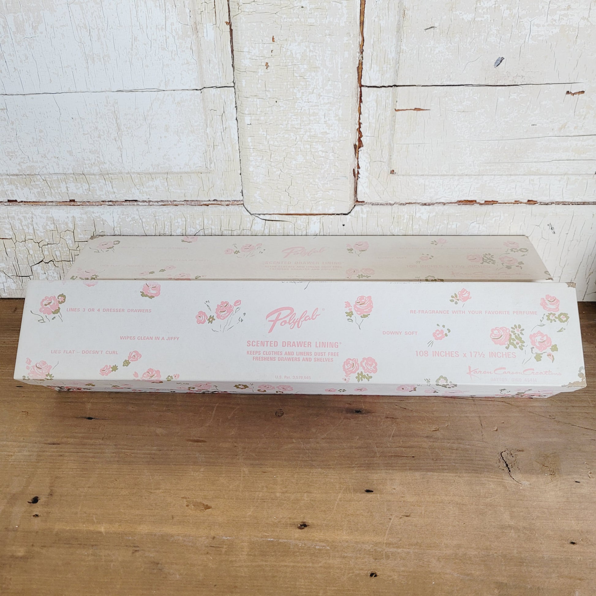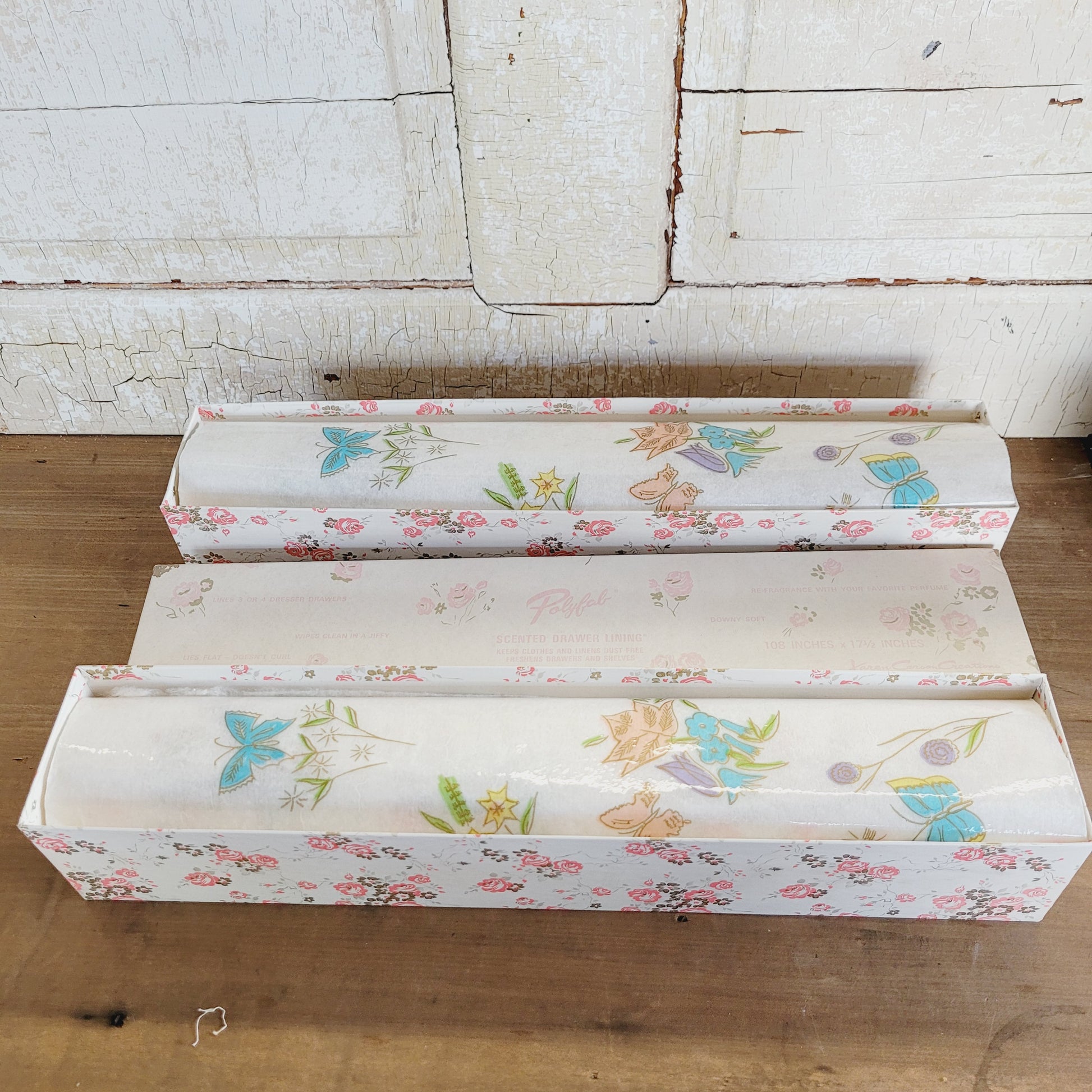 This bundle includes two fly rolls of liner – one for each wing! (OK, really they’re just rolls of drawer liner.) Both look like they've been cut, but still have plenty of powdery-freshness left. Plus, they come in their original boxes. These rolls have a cool butterfly pattern, and are 17 1/2" wide. A great find, even if the boxes have some fading and paper loss.