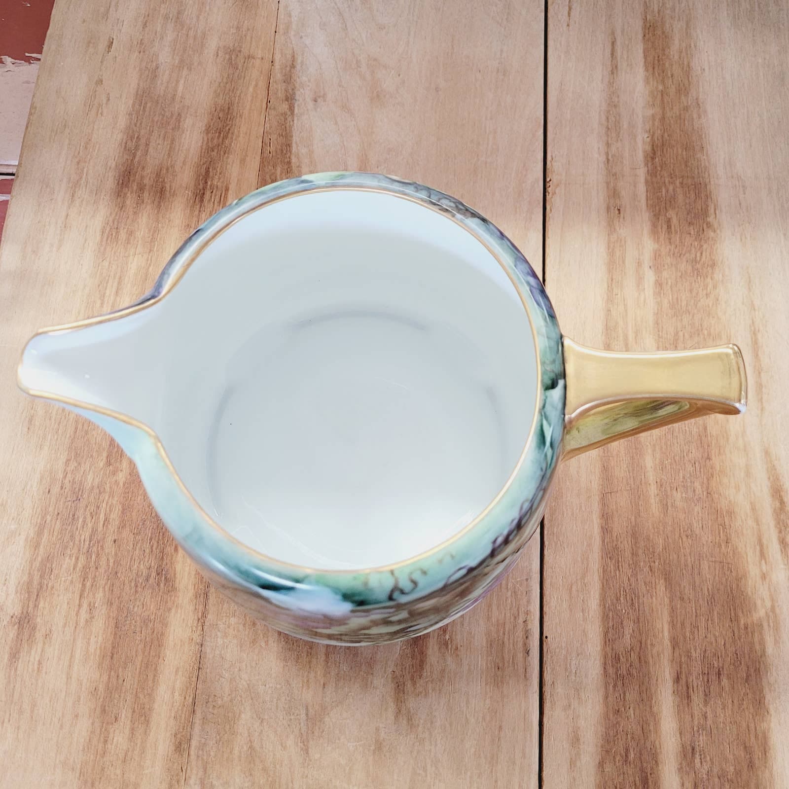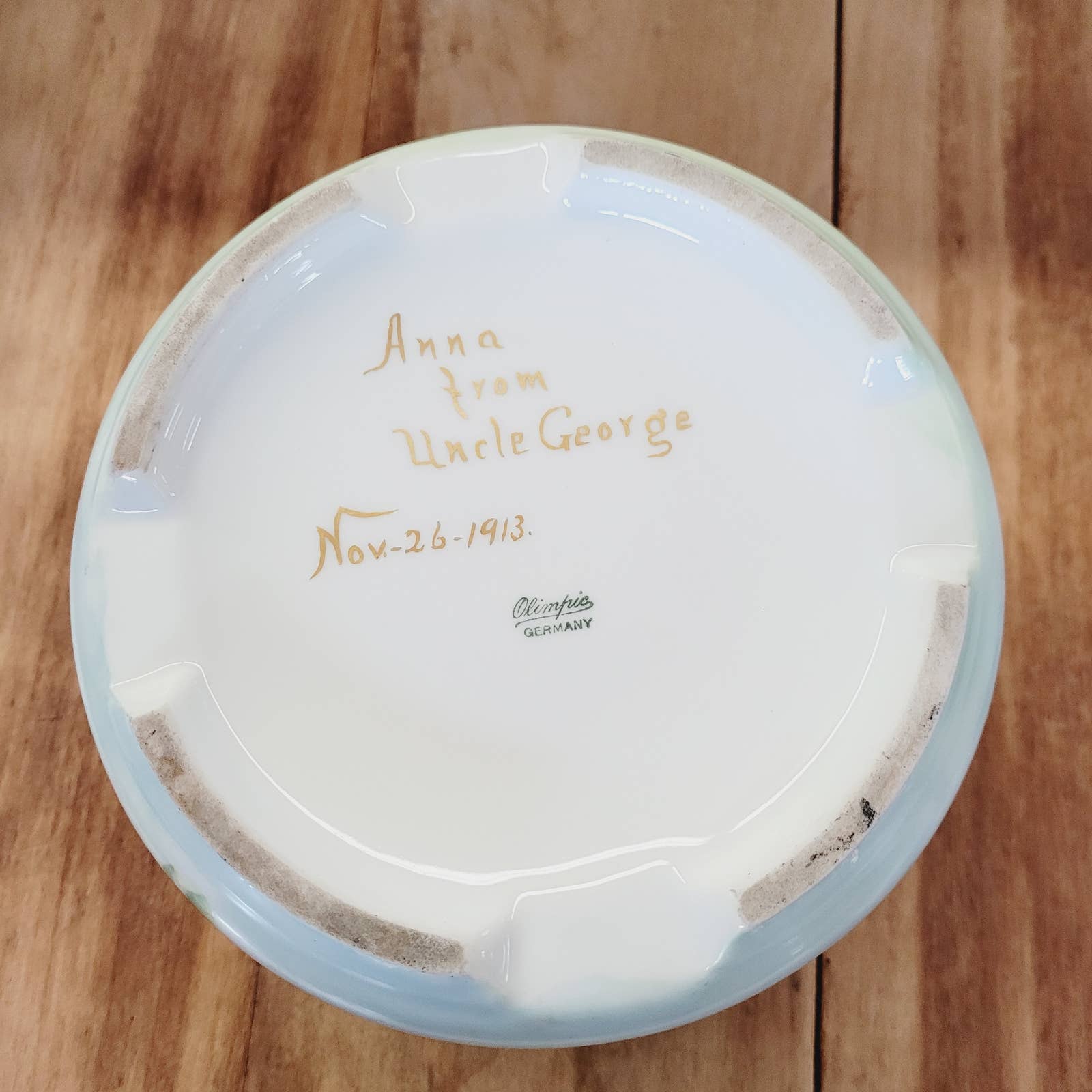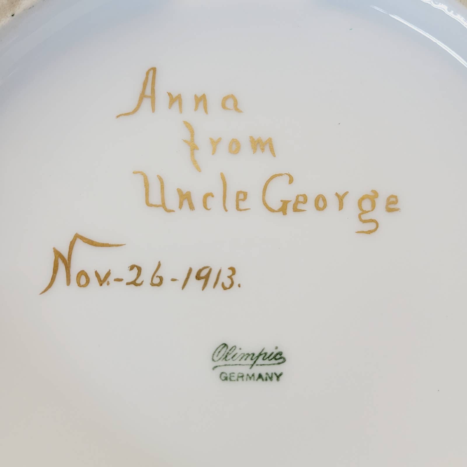Very pretty porcelain cider pitcher. With gold gilding along the spout, rim, and handle. Signed by handle, might say Nevian? Marked Olympia or Olympic Germany. Inscription on bottom, "Anna from Uncle George Nov-26-1913." Has some wear to the gilding and some metal marks near base, but is in otherwise great condition with no chips or cracks. Please see photos for further condition.
