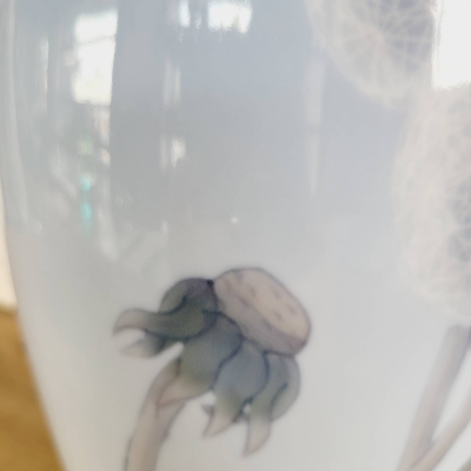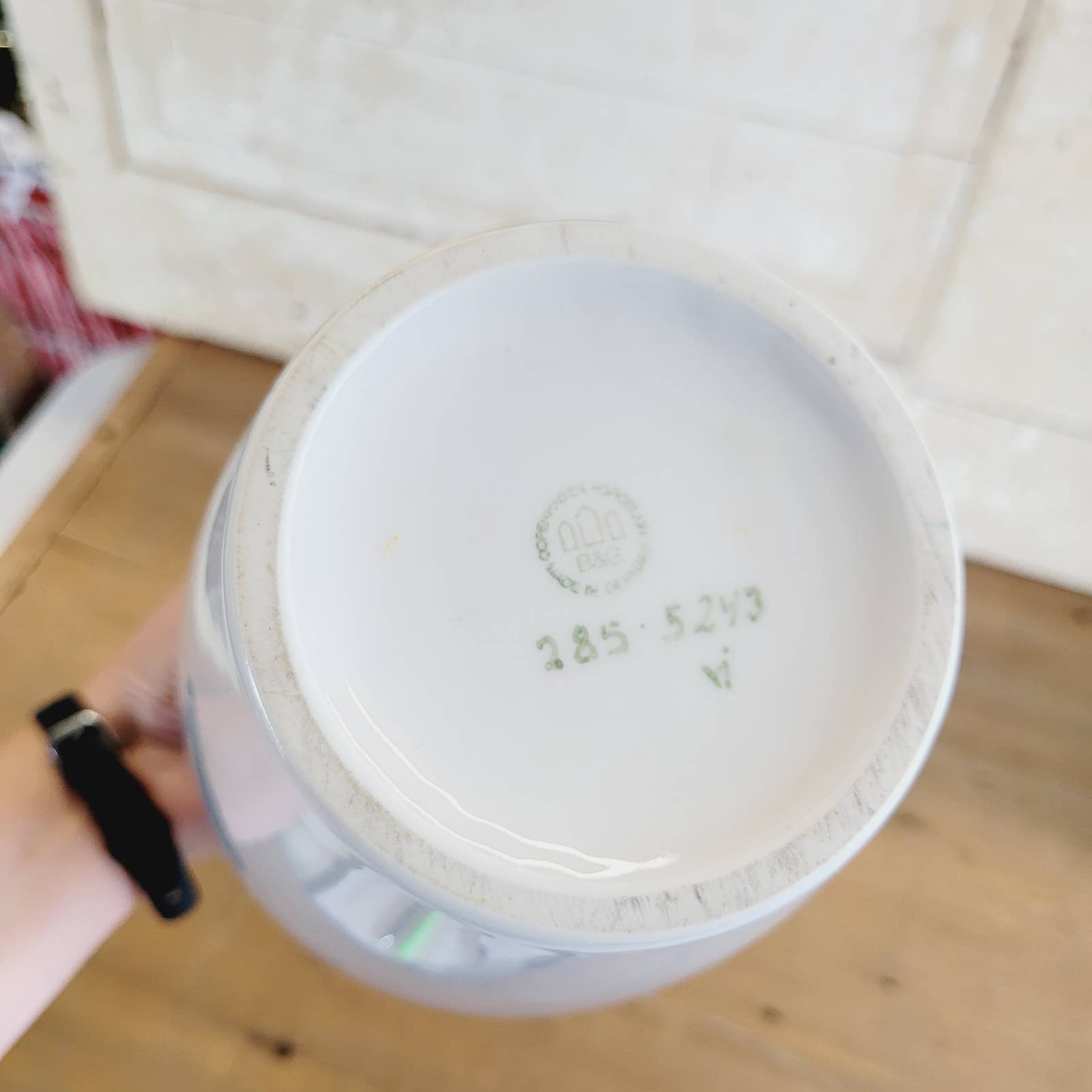 9 3/4" tall. Excellent condition. No chips, cracks, or repairs. Has one tiny white unglazed spot as shown in pic. Marked on base 285 5243