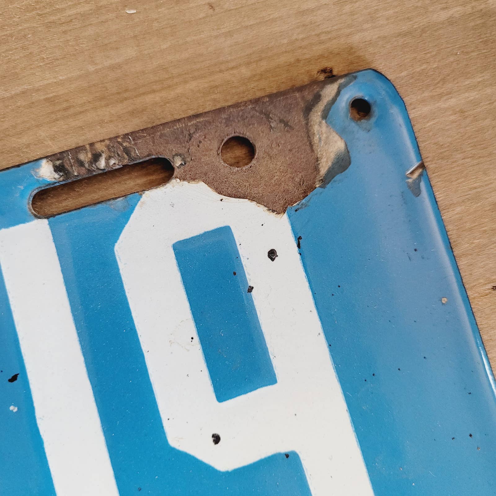 Has rust and missing porcelain, chips on edges. 13 7/8" x 6". Uncleaned. Please see photos for further condition.