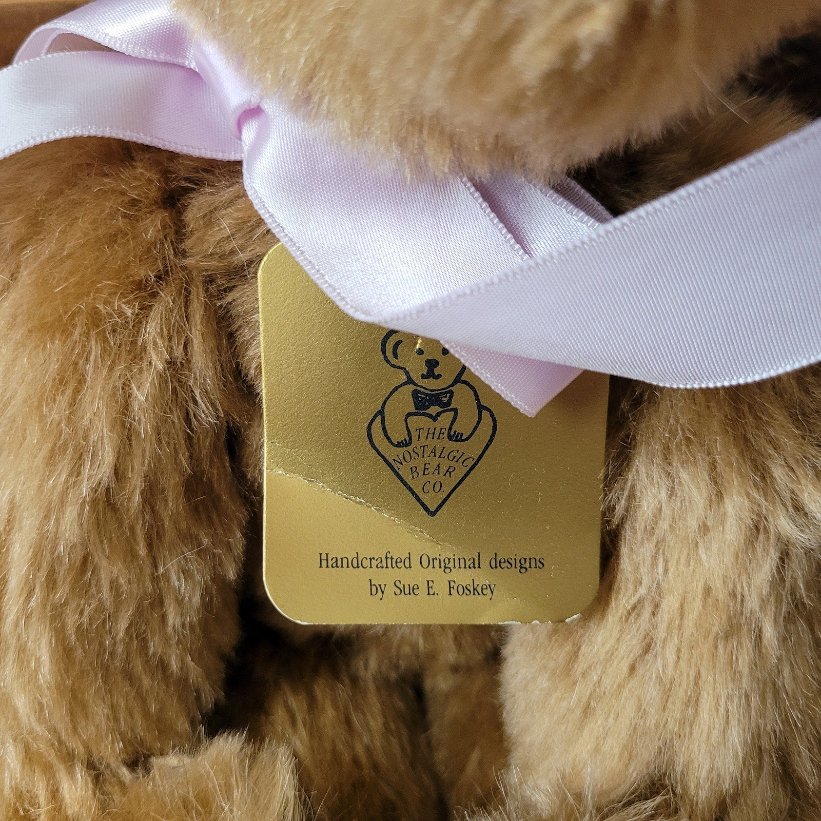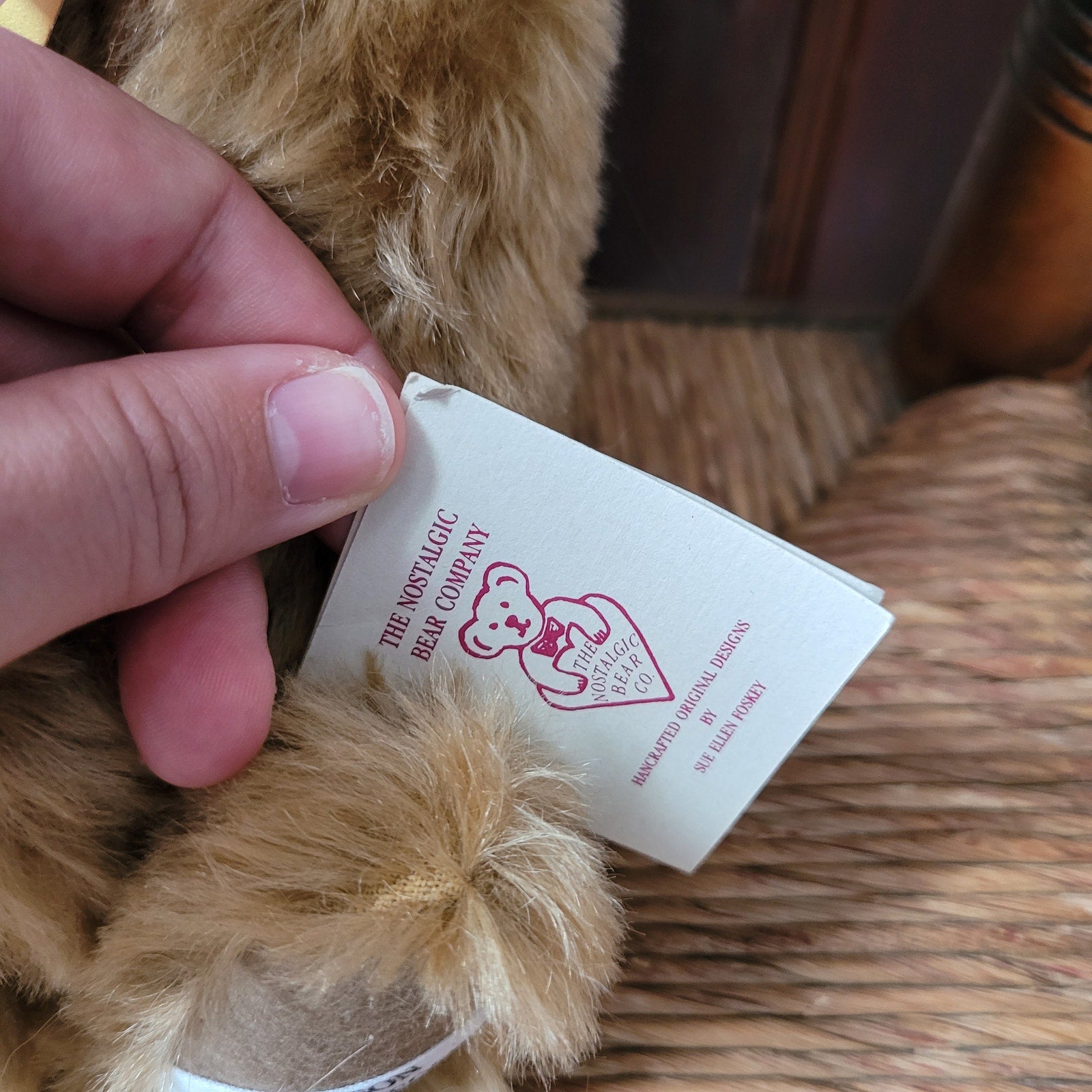 Embrace rare vintage charm with this Limited Edition Sue Foskey Nostalgic Bear, Harrison! Crafted in 1987, this jointed bear is a numbered gem, being 71 out of 100. Signed by the artist, it adds an exclusive touch to your collection. Reuben stands at about 12 1/2" tall and is in great condition, showcasing timeless craftsmanship. While the bear itself is in great condition, note that the tag has some creasing. Own a piece of limited edition nostalgia – bid now and welcome Harrison into your bear hug!