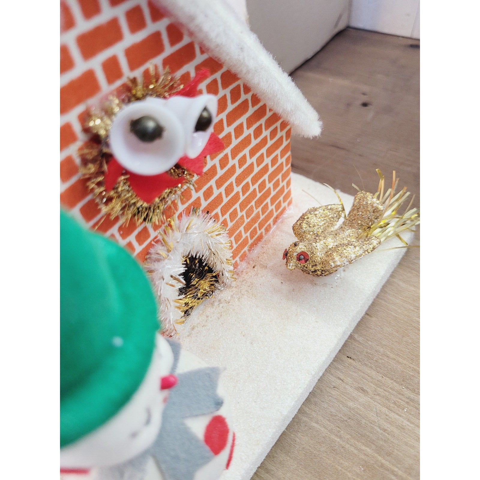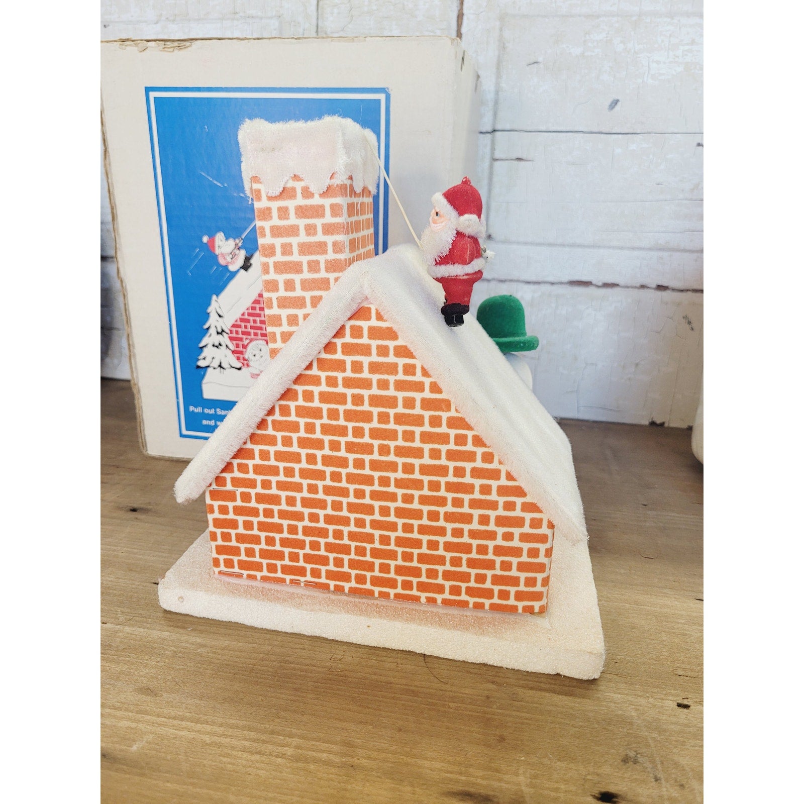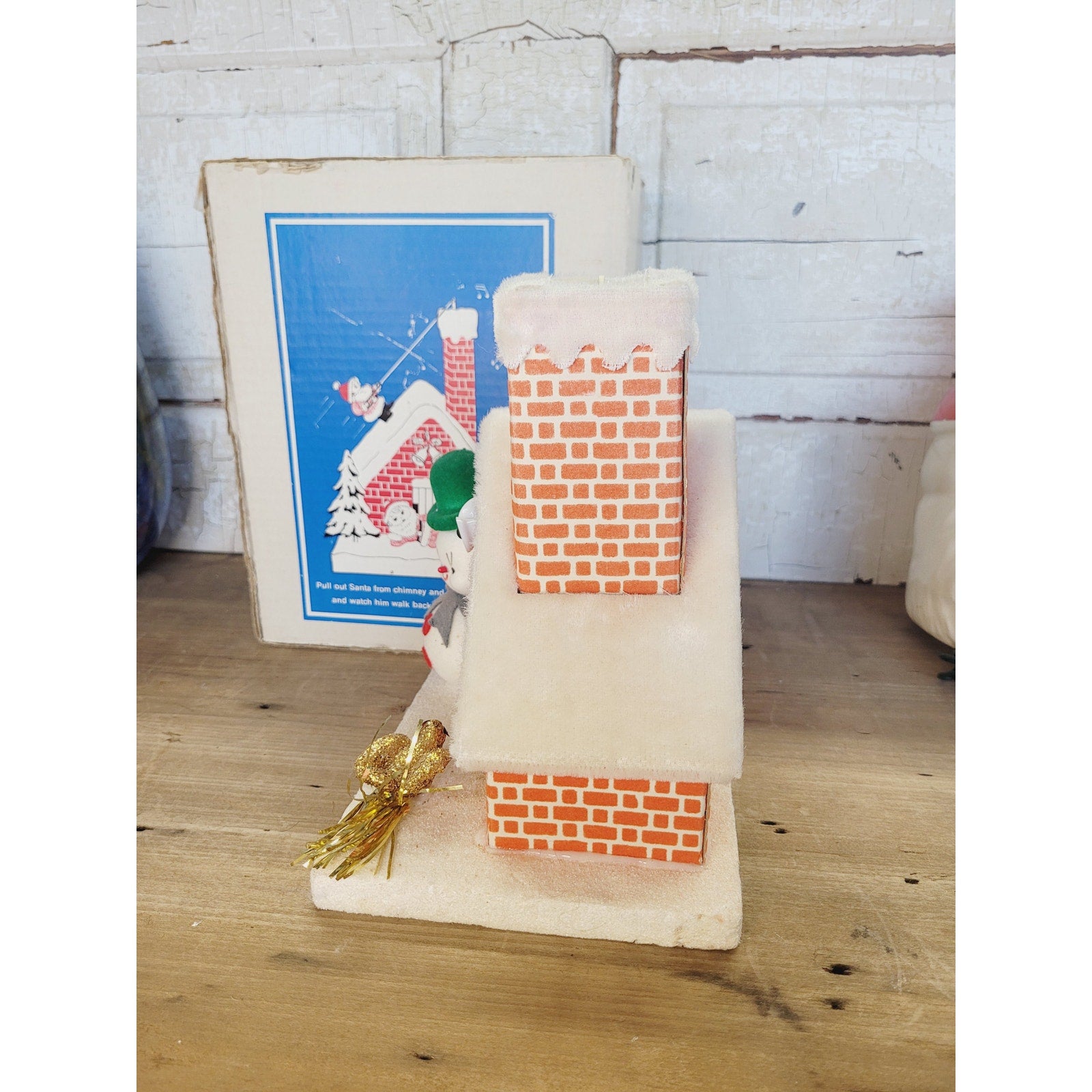 Bring nostalgic magic to your holiday with this rare vintage pull string Santa chimney scene. When the string is pulled, Santa climbs the chimney to the tune of Jingle Bells — a whimsical mid-century Christmas treasure.
