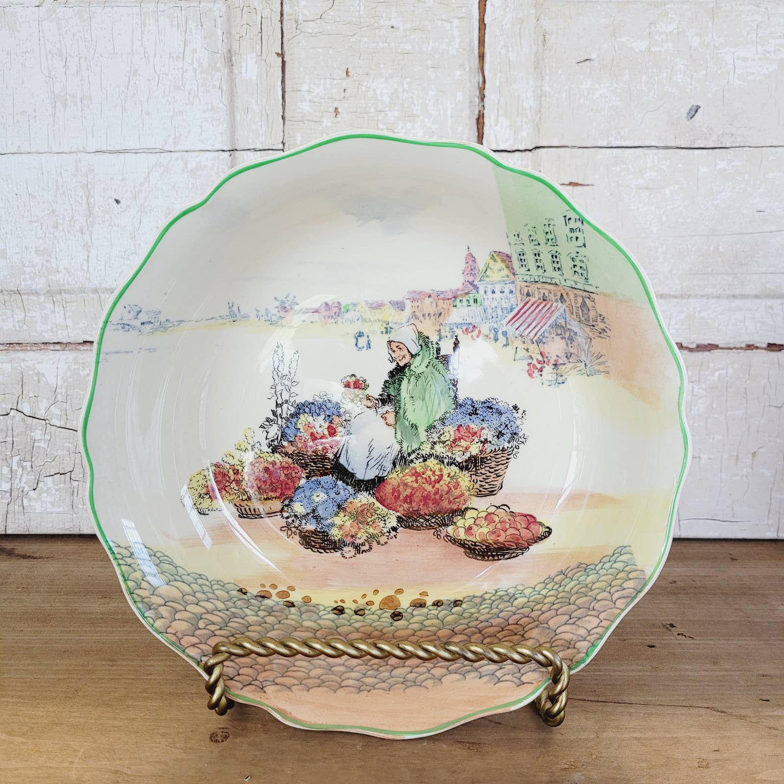 9 1/4" across. No chips, cracks, or repairs. Colors are bright.