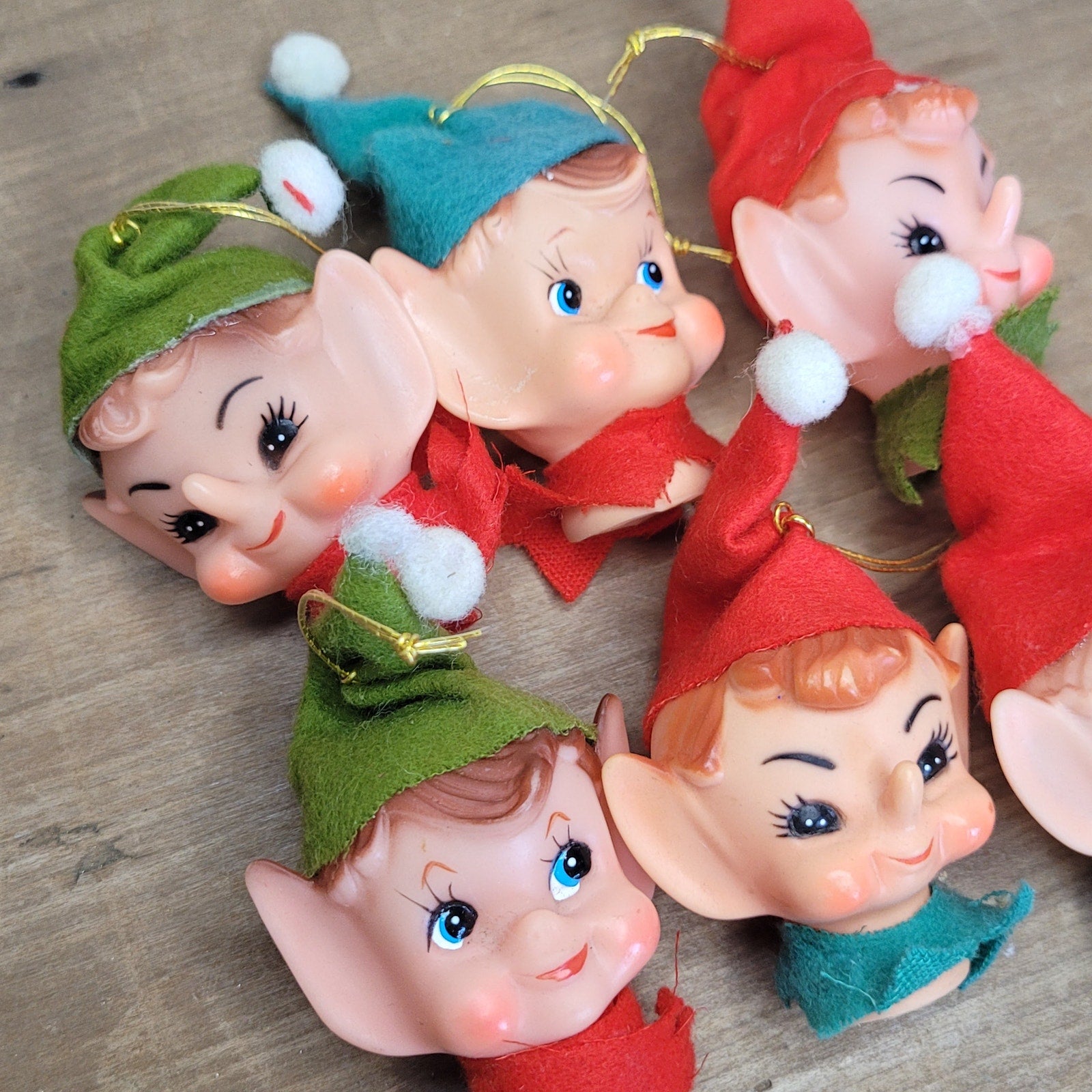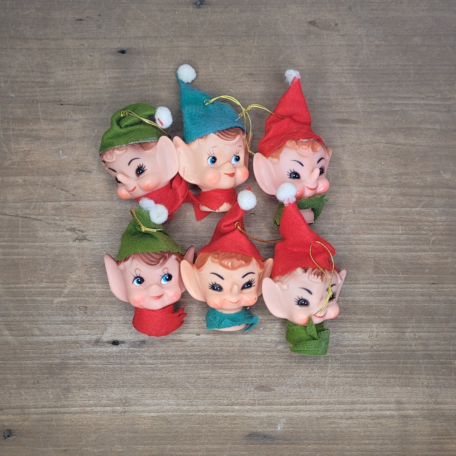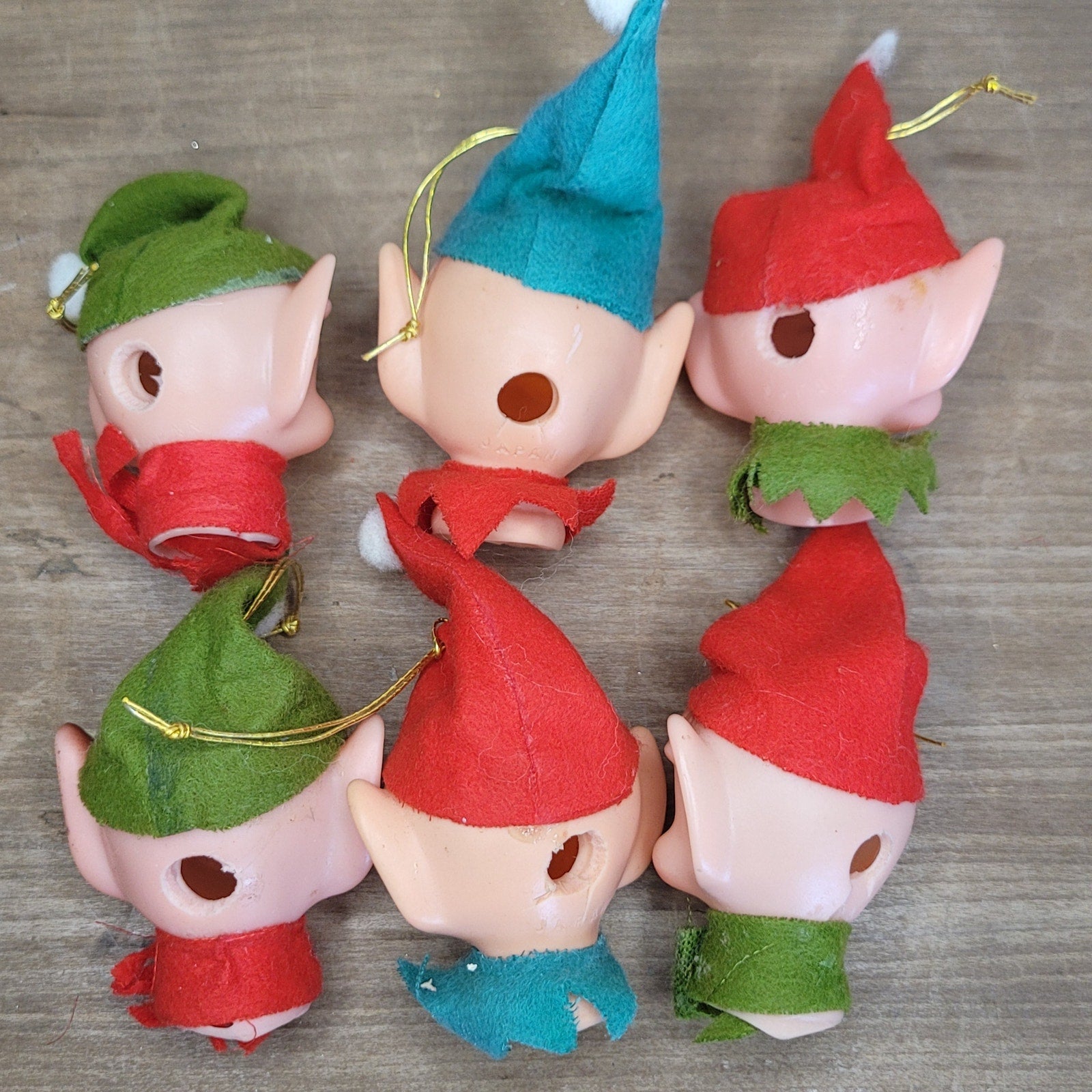 Charming set of 6 vintage Christmas elf pixie head light covers, marked Japan on the back. Each measures about 2 ¼" tall and features classic knee hugger elf faces with felt hats and collars in red, green, and blue.