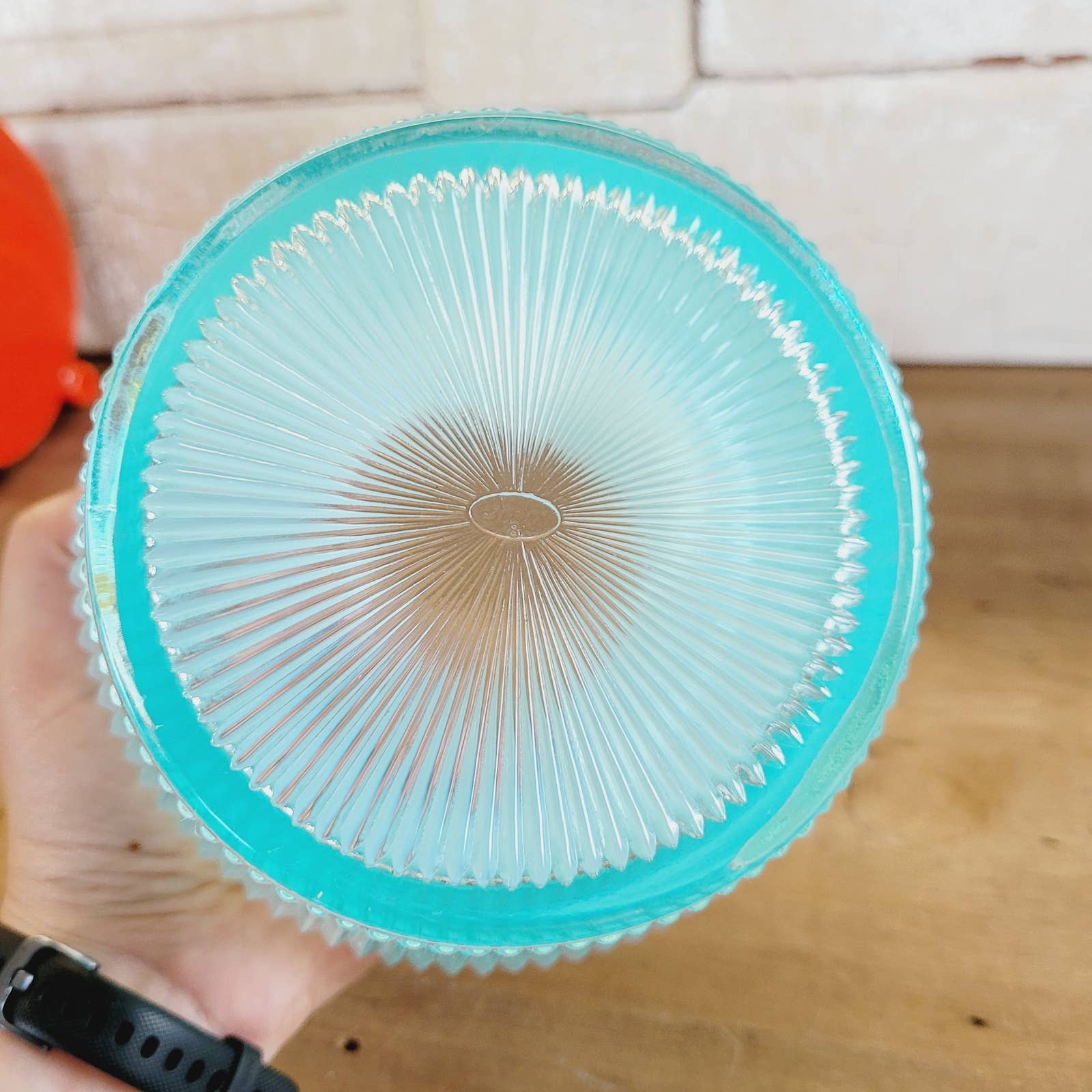 About 6" wide x 5" tall. Has Fenton sticker and marking on bottom. Has a small manufacturer flaw on bottom of one of the ribs as shown in pics. No chips or cracks other than the flaw stated.
