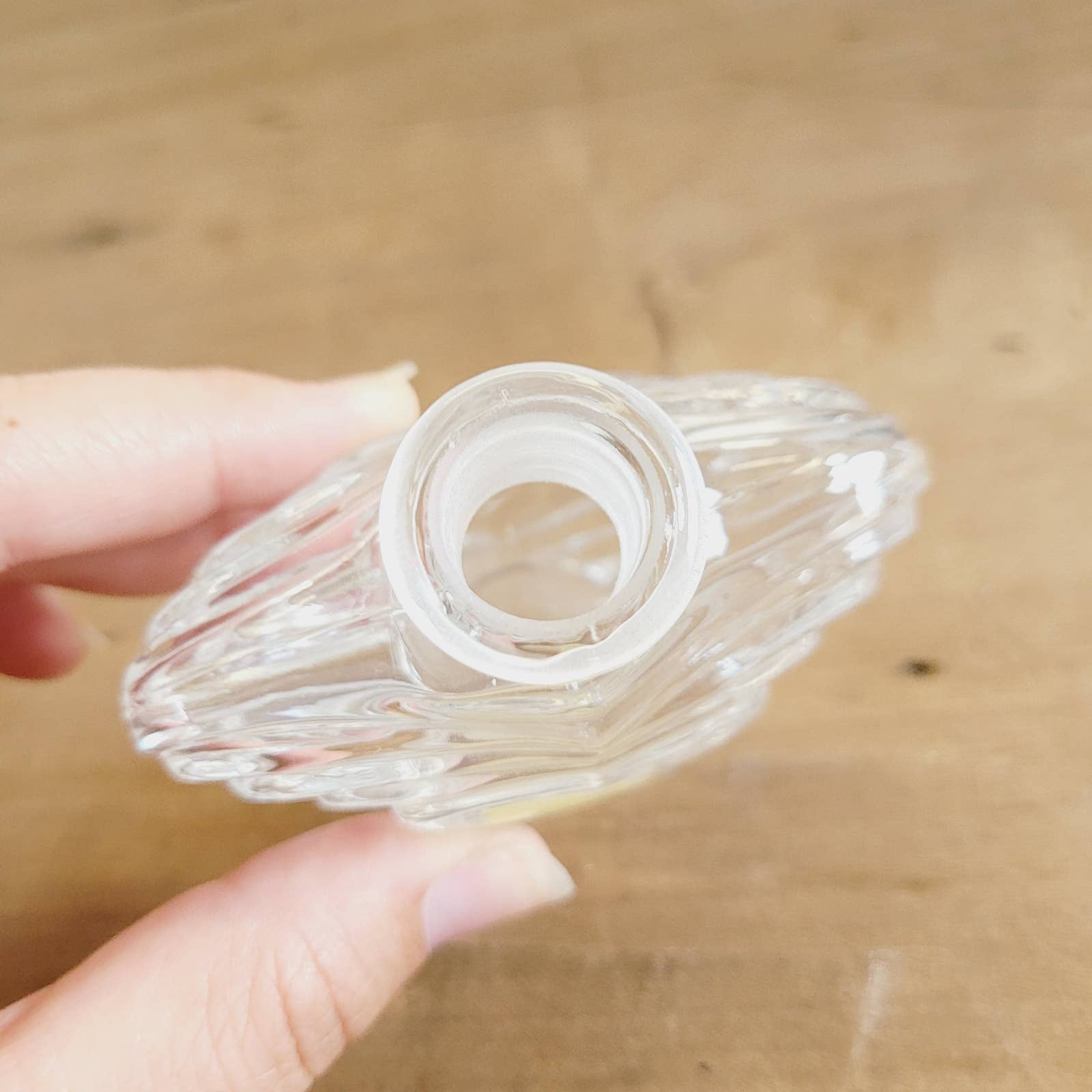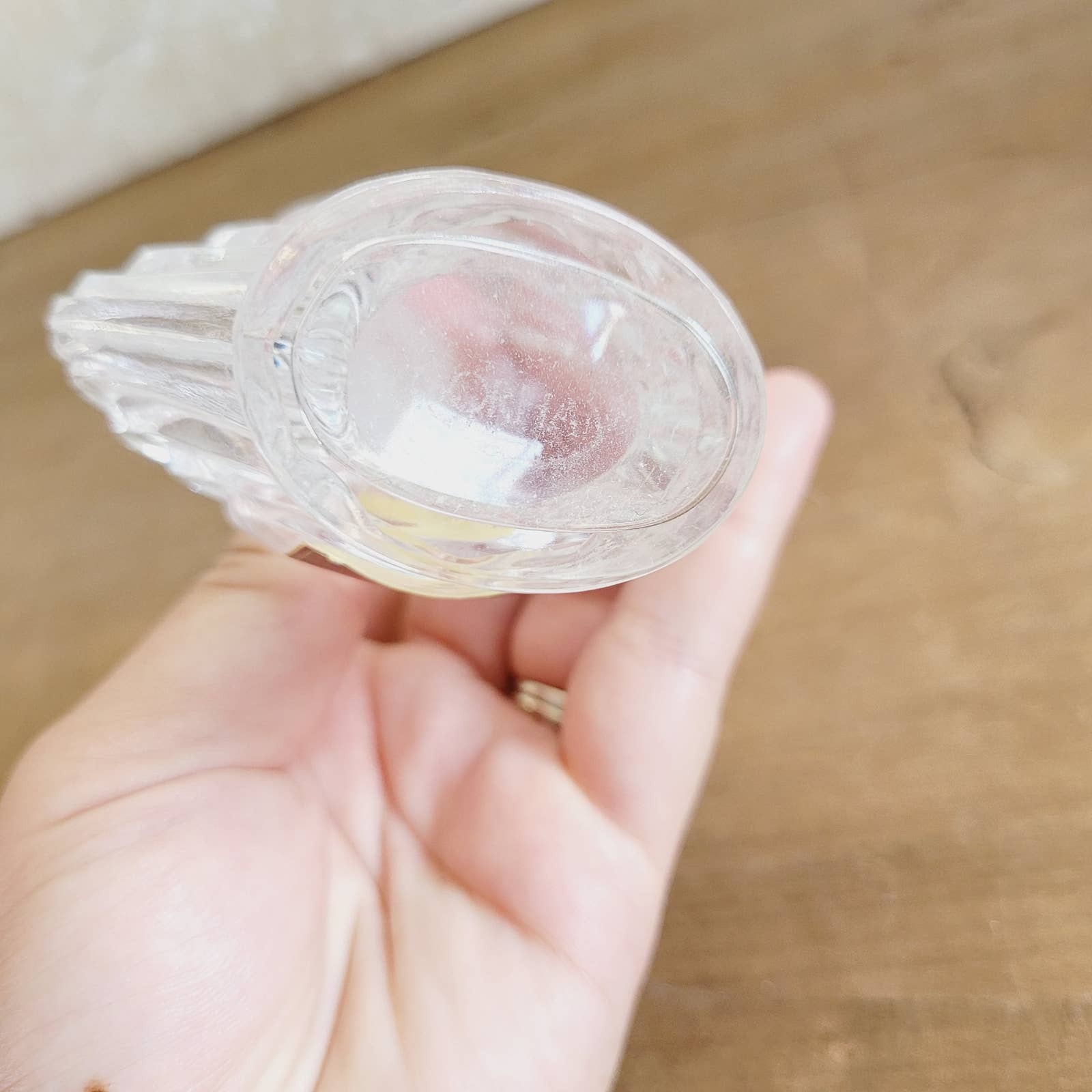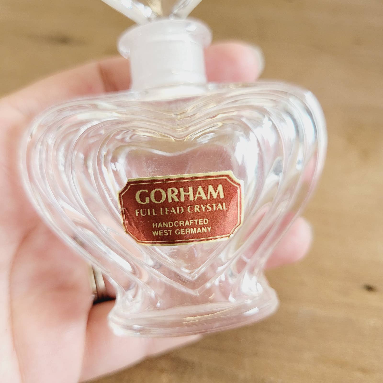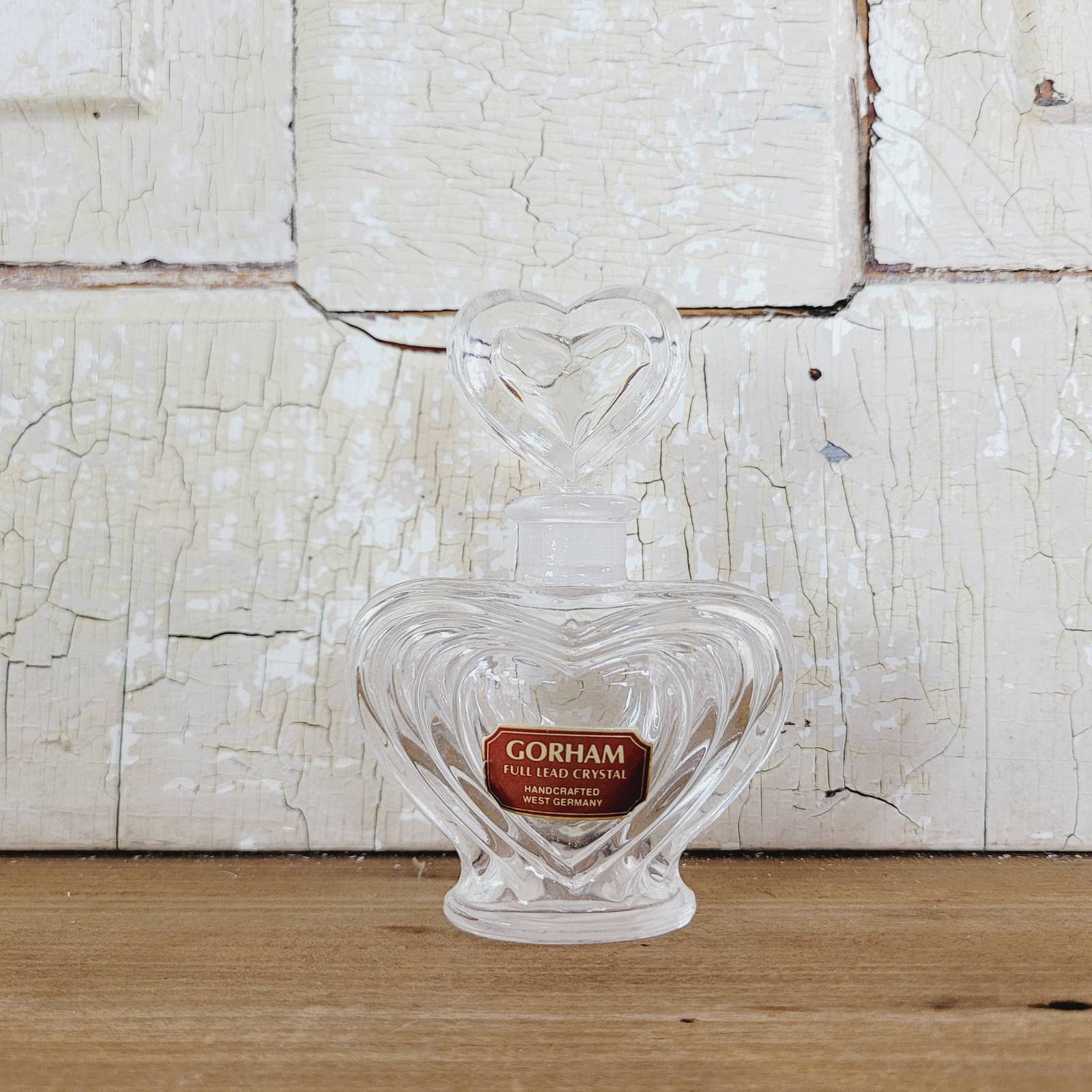 This vintage Gorham full lead crystal perfume bottle has a unique heart shape and stands about 4" tall. With a Gorham sticker and base marked with the Gorham name, it provides a crystal-clear, timeless elegance. No chips or cracks. Perfect for a collector or a romantic gift.