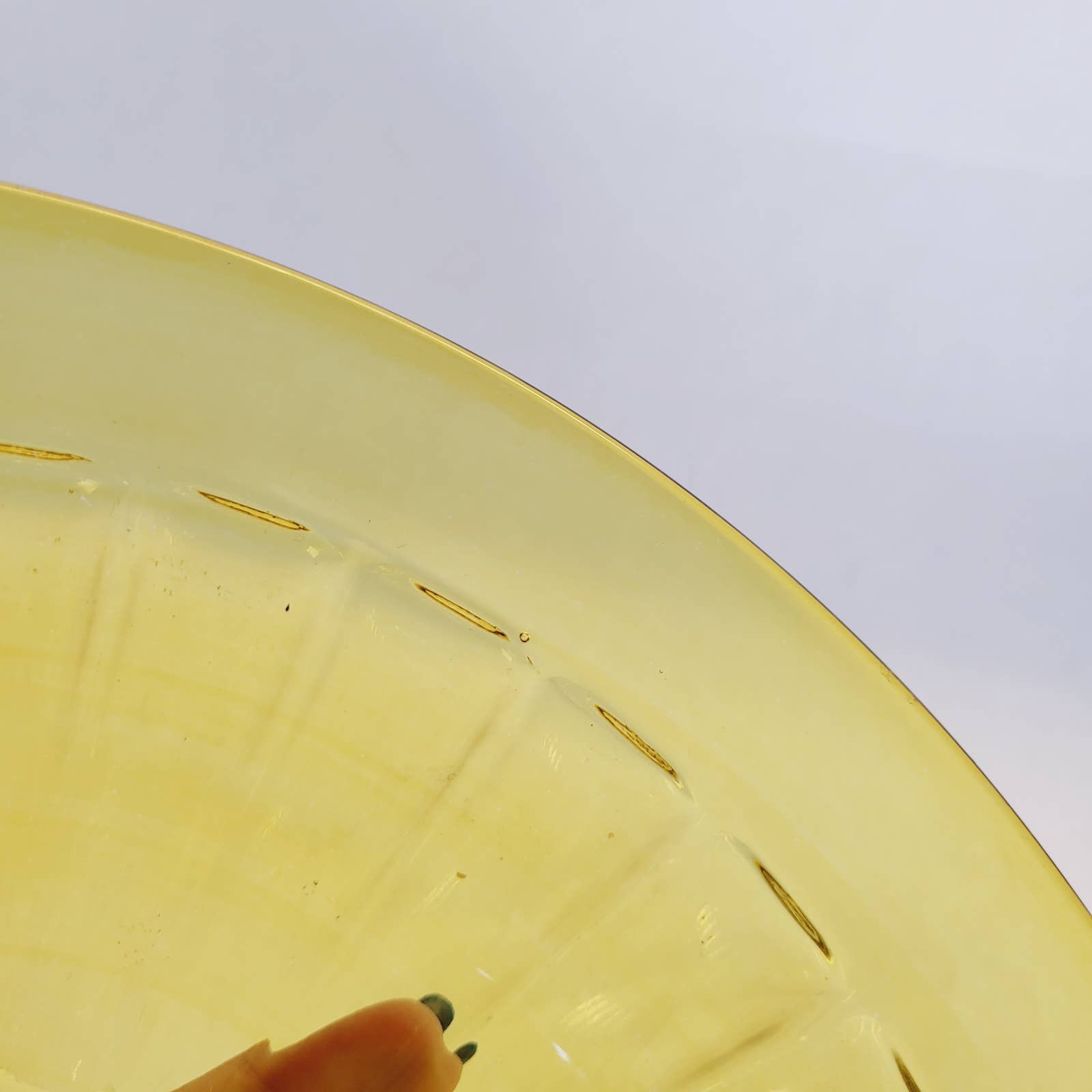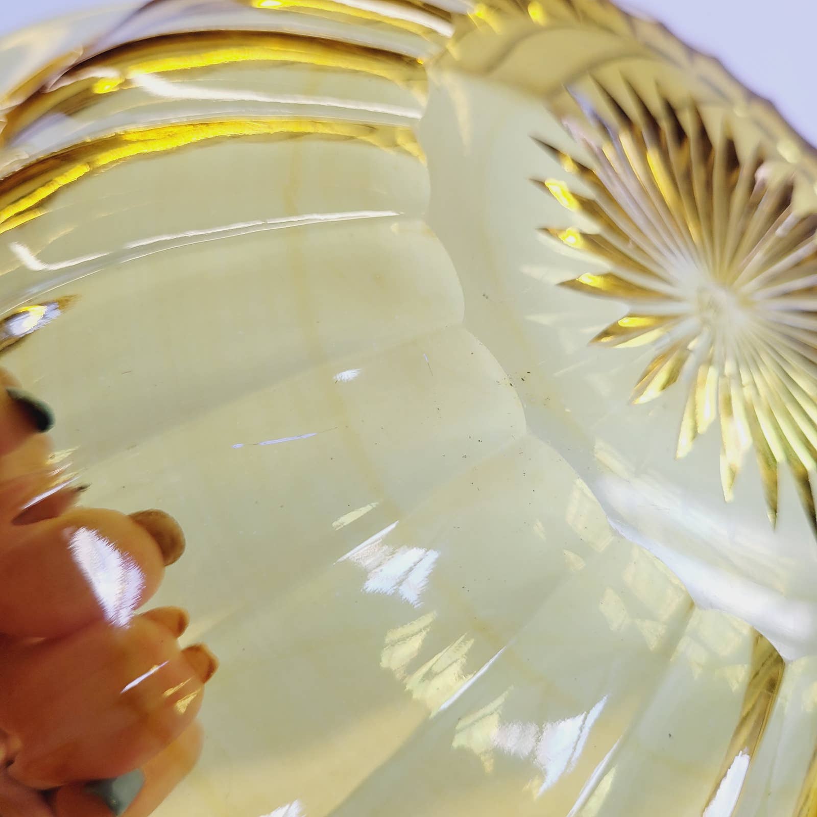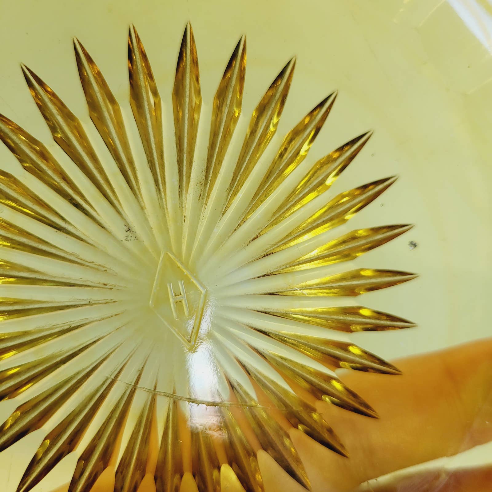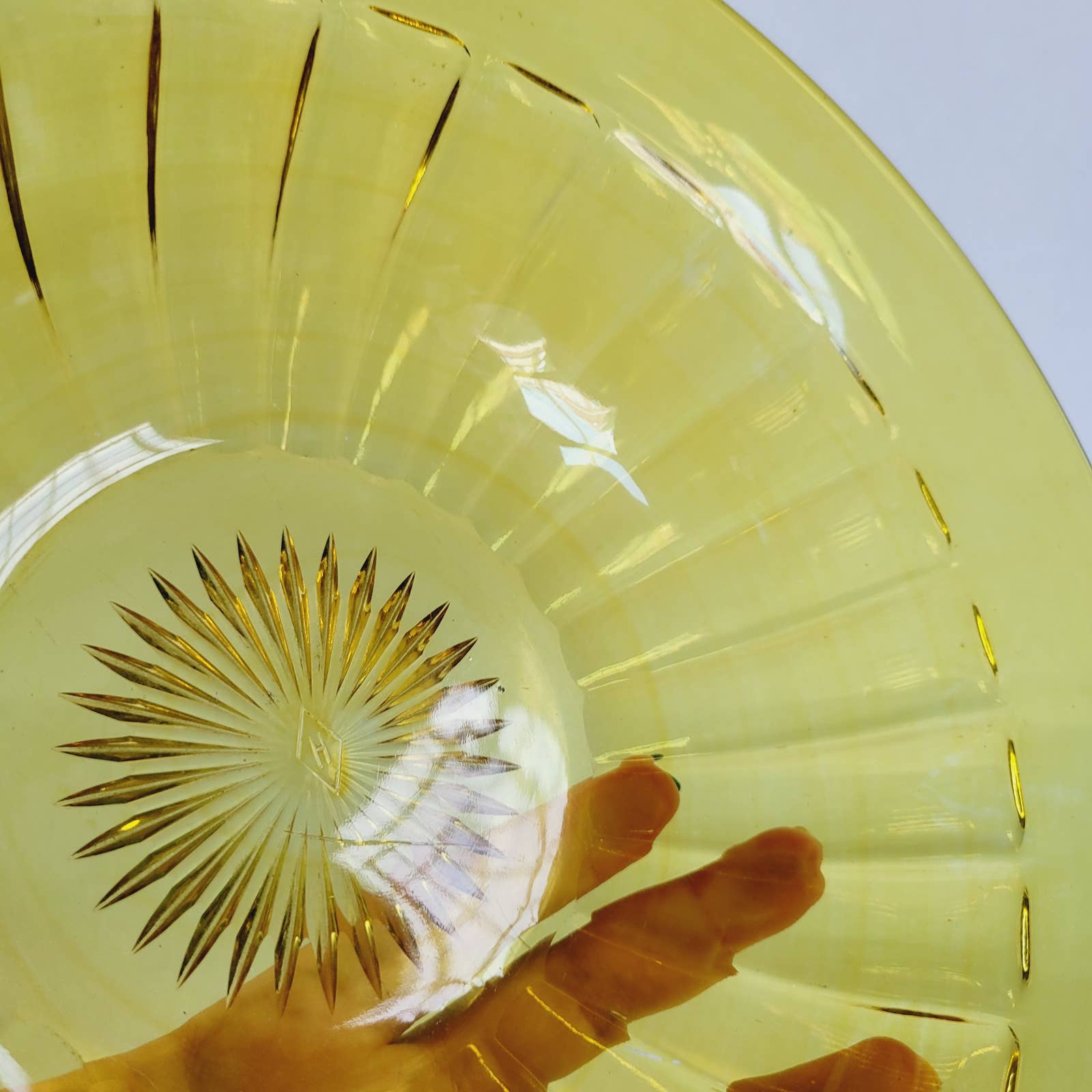 Bowl is about 9 1/2" across. No cracks. Has a few surface scratches on base on one inside. H in diamond marking. Has some color swirling in it. Has a flea bite on inside on base. Please see photos for further condition.