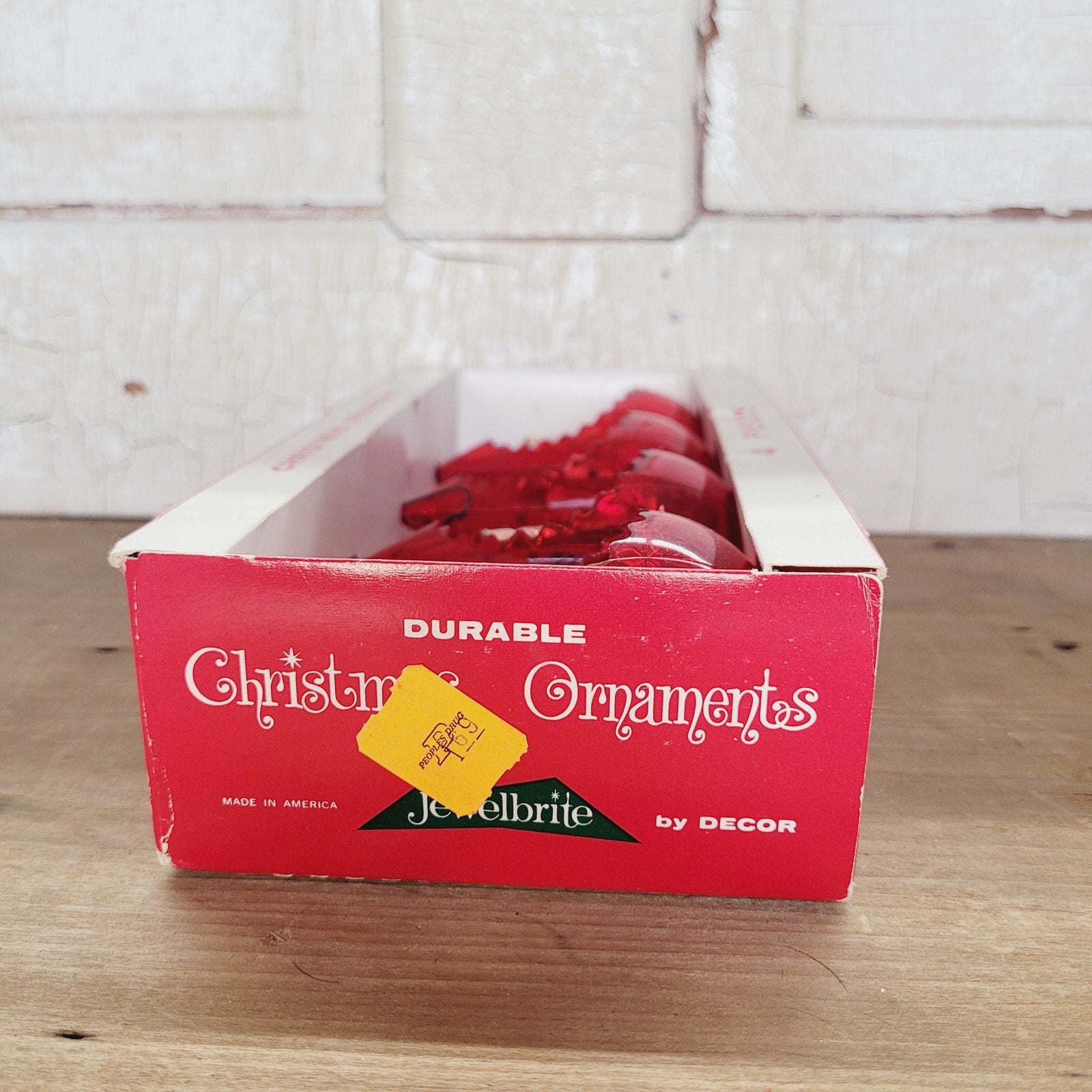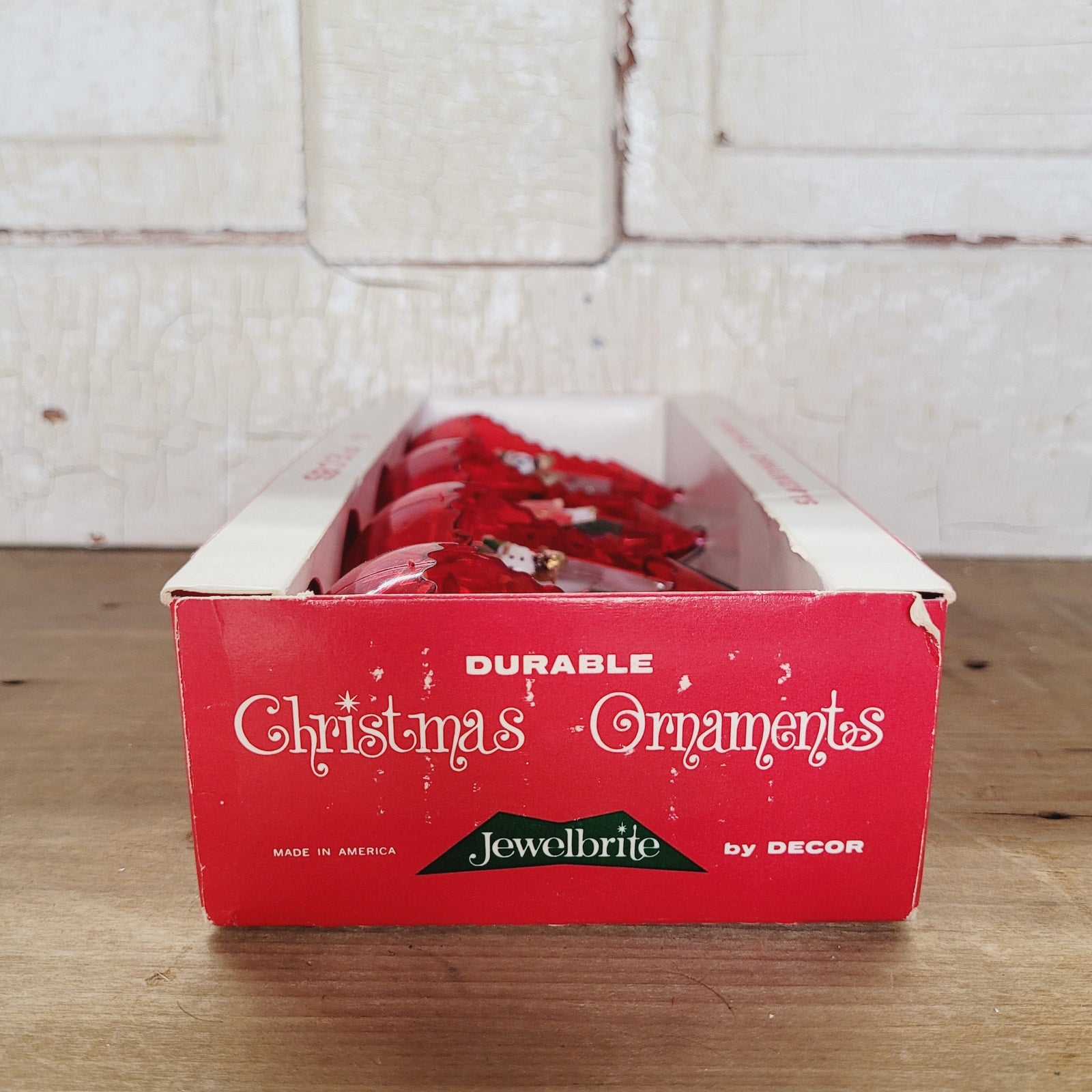 Vintage Jewel Brite Diorama Christmas Ornaments Red Teardrop Set of 4 with Box
