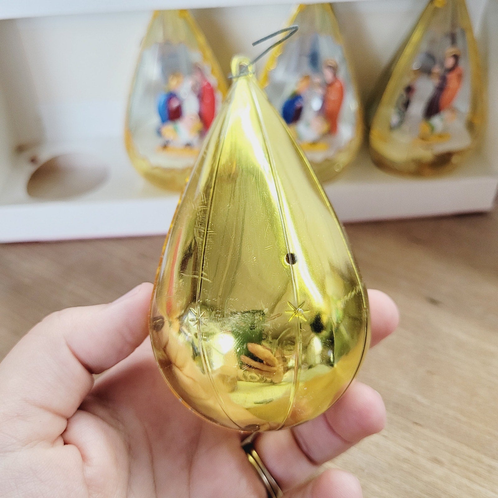 Vintage set of four Jewel Brite Christmas ornaments by Decor Novelties Inc., Whitman, Massachusetts. These teardrop-shaped plastic ornaments each feature the Nativity scene inside, with Mary, Joseph, and Baby Jesus surrounded by sparkling snow. Made in the 1950s–1960s, Jewel Brite ornaments were a popular choice for aluminum Christmas trees and classic mid-century décor.