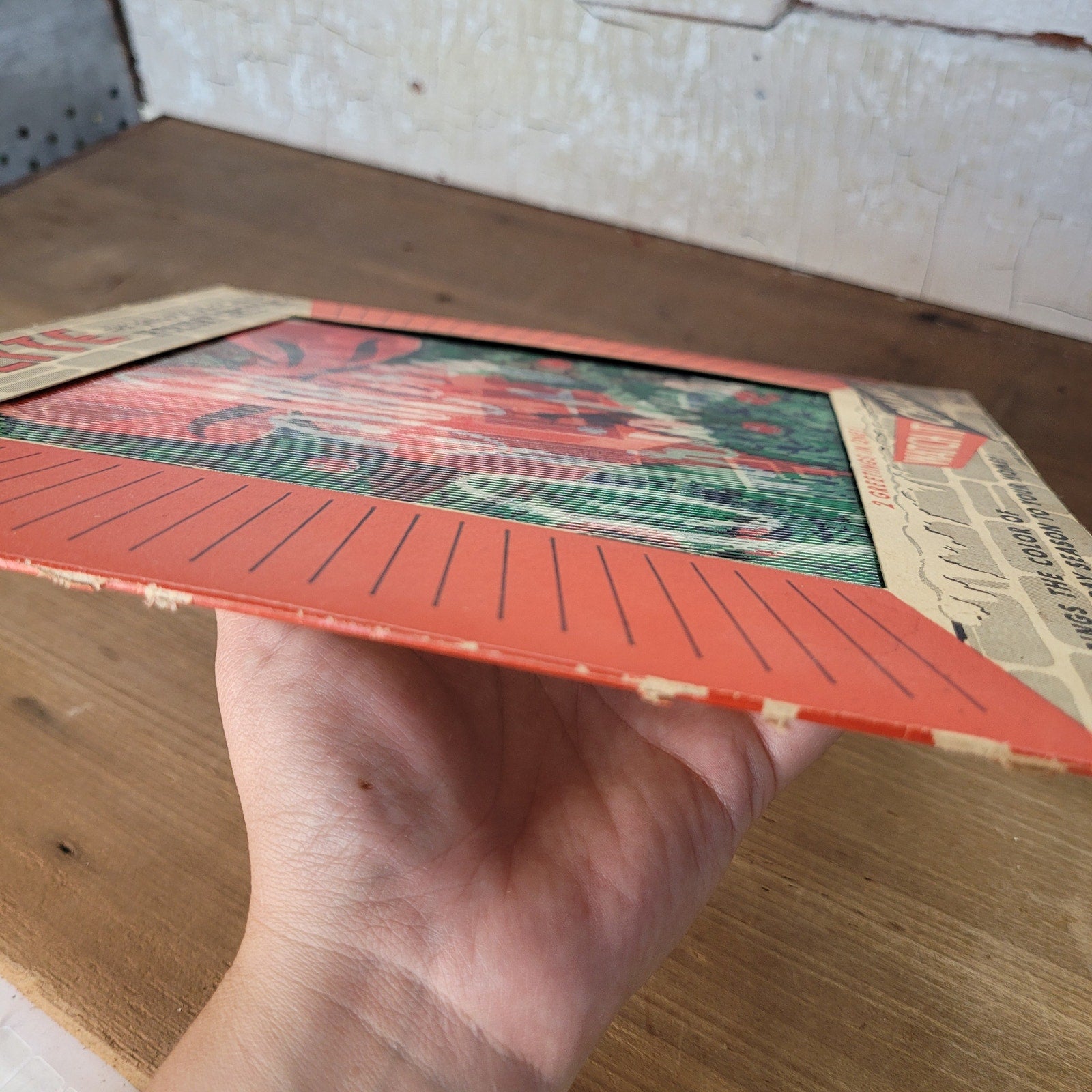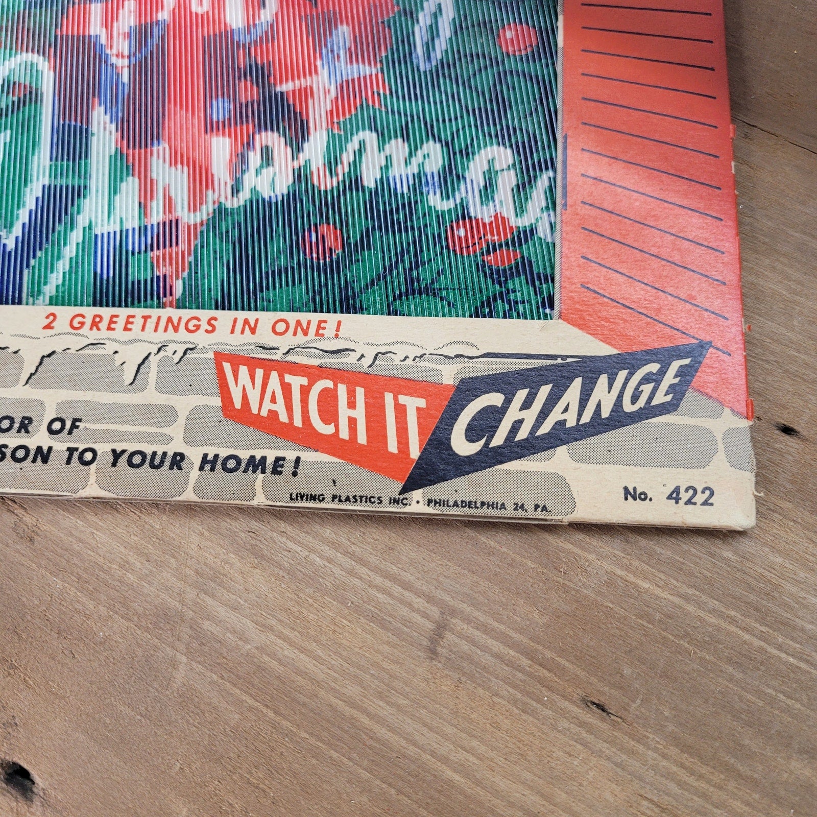 Vintage Life-Lite Magic Motion holiday greeting sign by Living Plastics Inc., Philadelphia. This lenticular display shifts as you view it from different angles, showing two greetings in one: “Merry Christmas” with a wreath and bow, and “Happy New Year” in bold festive lettering.