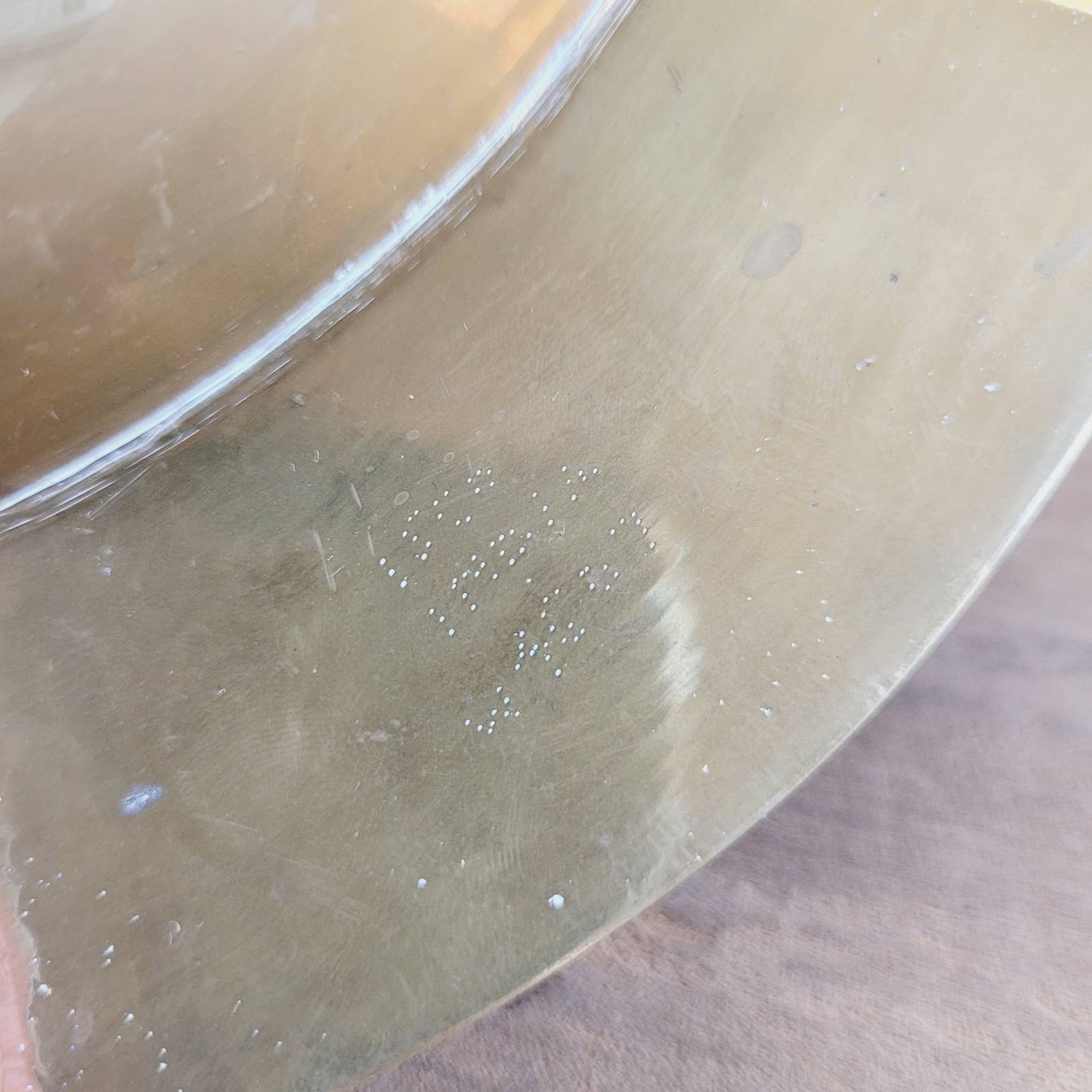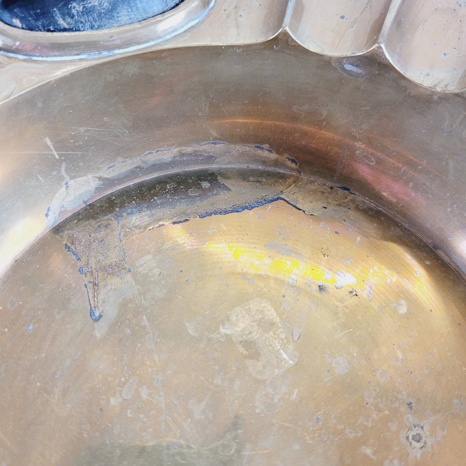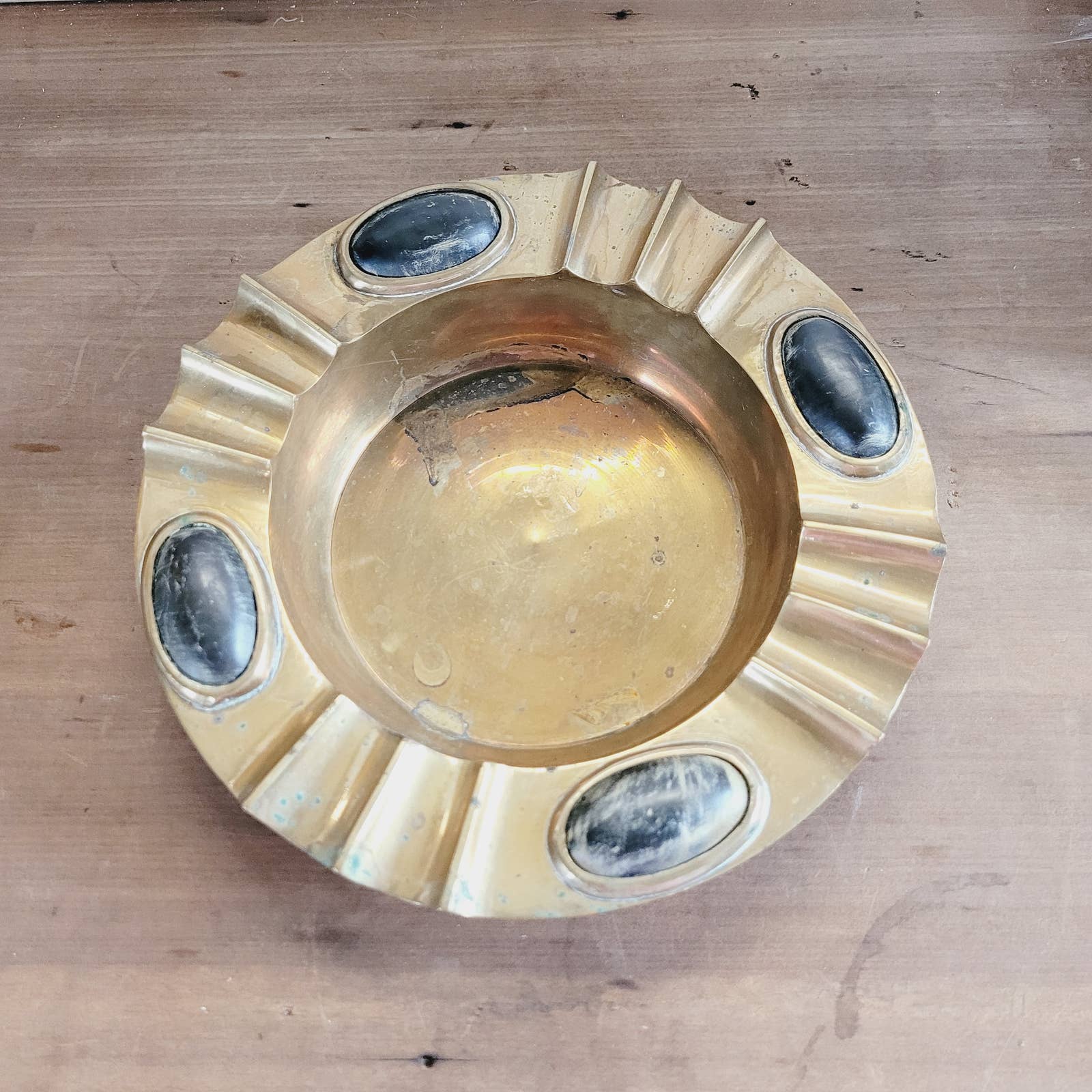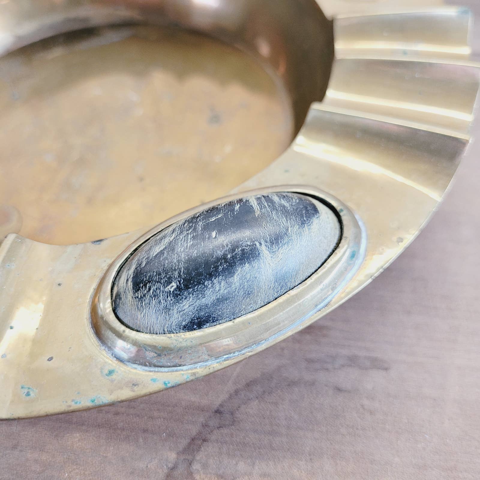 Introducing a vintage cigar ashtray in the iconic Mid-Century Modern style, fashioned from solid brass and adorned with tasteful black wooden decor inlays. Underneath, you'll find the marking "India," a testament to its origin and 5 cork circles to prevent surface scratches. Has some tarnish and wear, and residue from polish in crevices. Measures approximately 9 1/2" across.