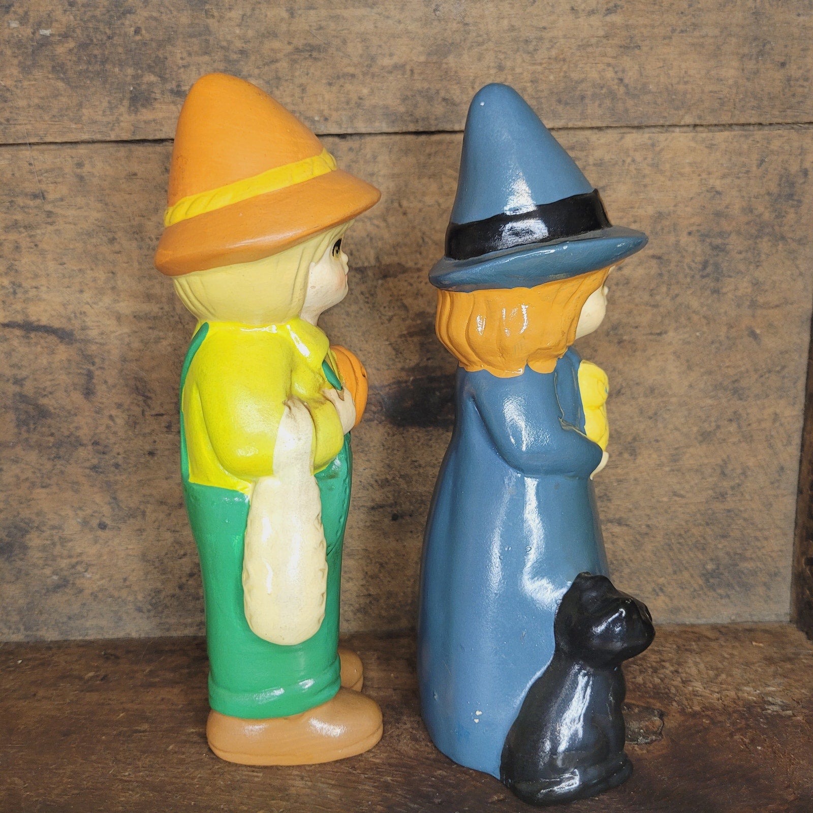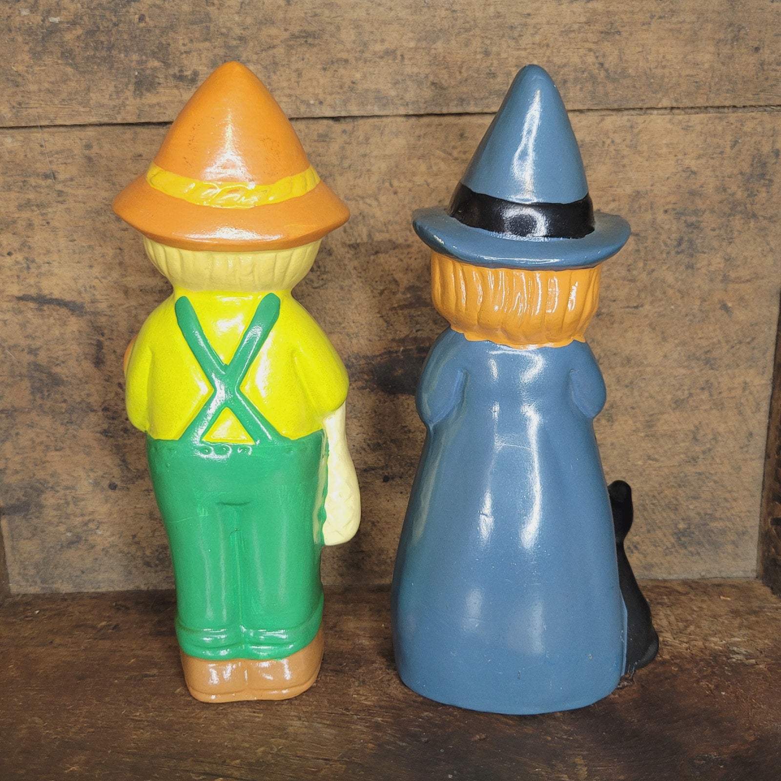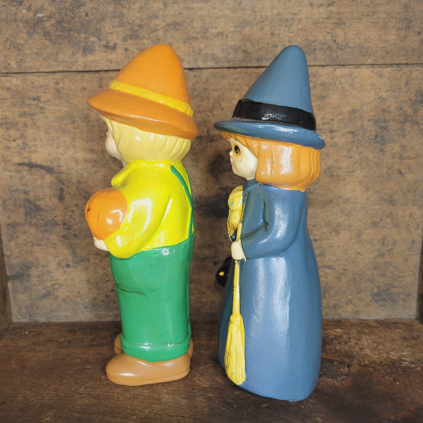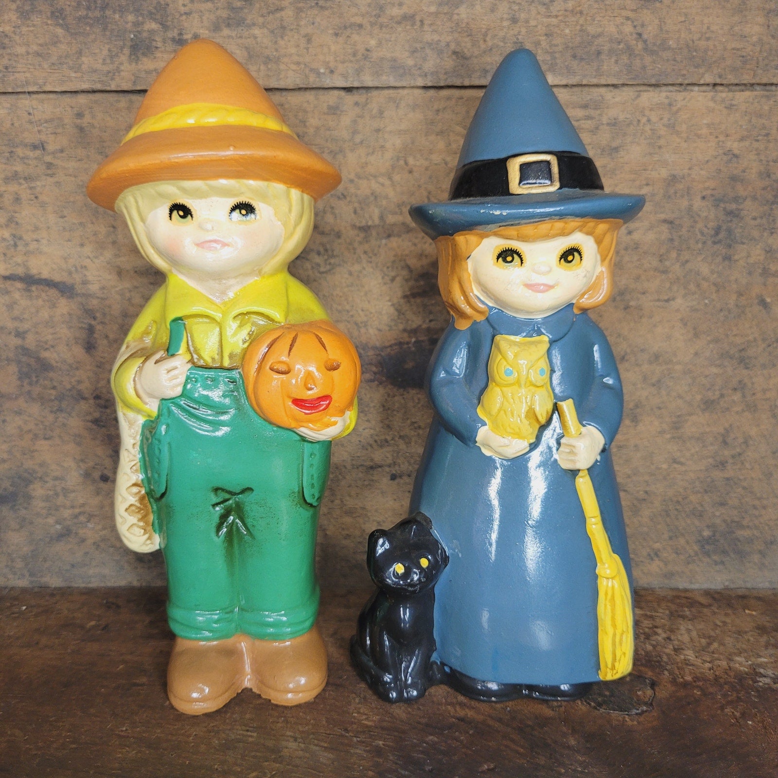 Featuring a Scarecrow Boy and Witch Girl, both standing approximately 6 1/2 inches tall. These delightful figurines are perfect for adding a nostalgic touch to your Halloween décor.