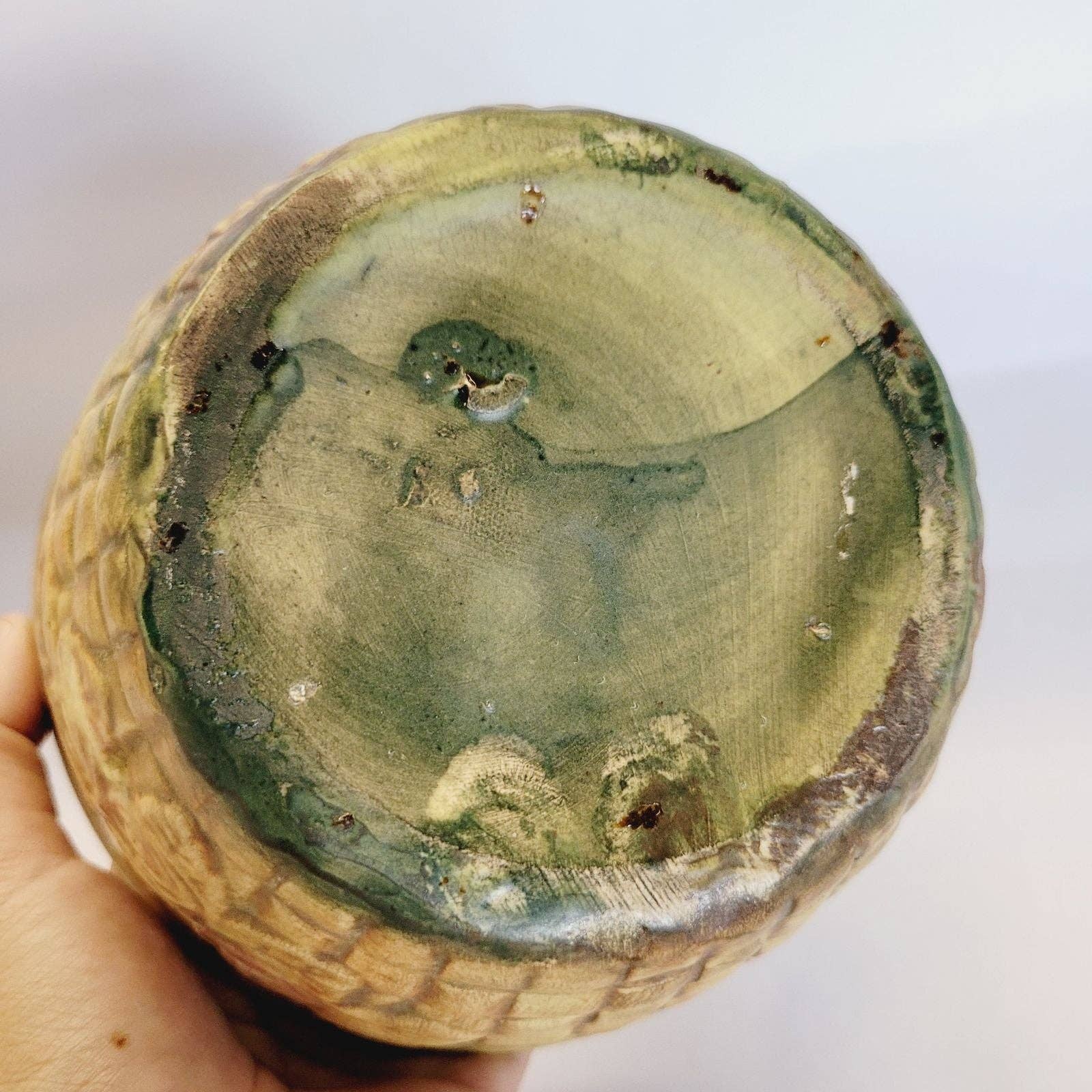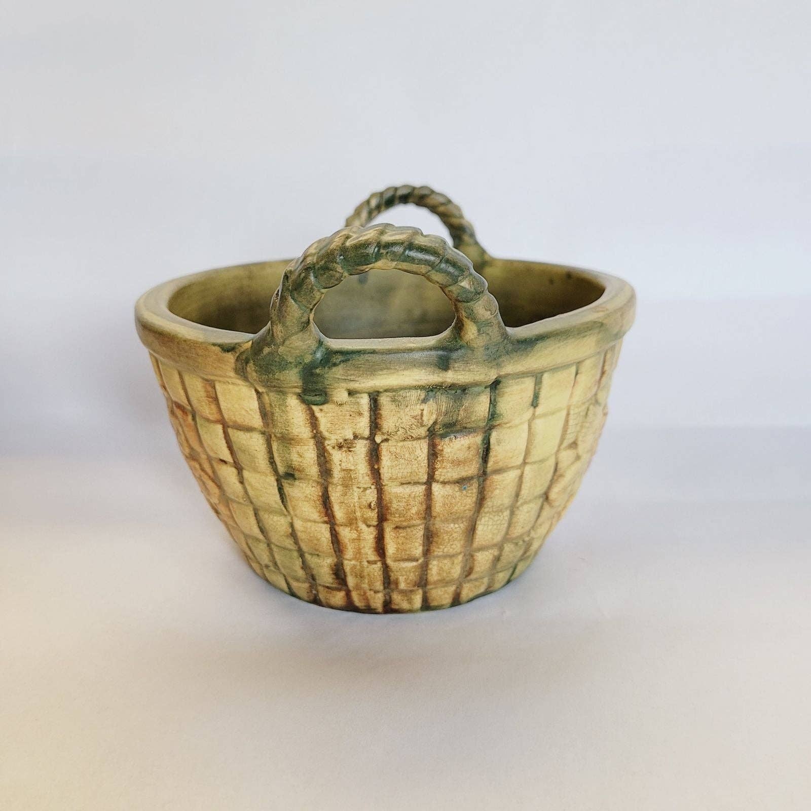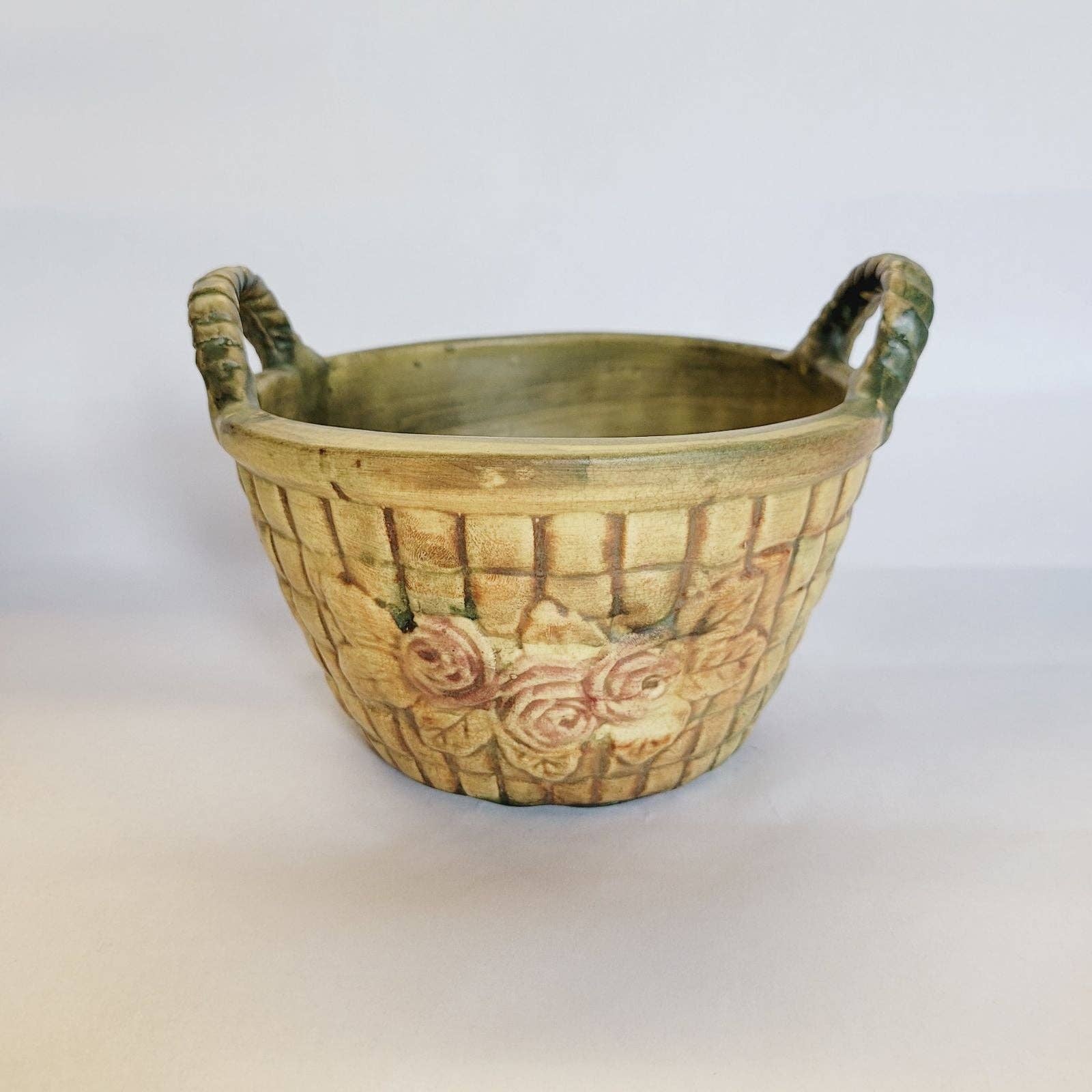 Weller Pottery basket in the Flemish pattern from 1913-1920. Flemish, a line of pottery designed by Rudolph Lorber and introduced in the mid teens, features naturalistic forms and woodland motifs in earth toned shades. This Weller Flemish basket features three deeply molded roses set against a basketweave texture with braided handles. This basket is not marked on the bottom with a Weller mark. No chips or repairs. Dimensions: About 5" high x 6 1/4" diameter. Has crazing.